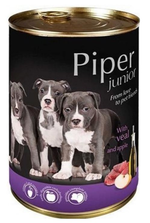 A PIPER JUNIOR borjúhússal és almával egy teljes értékű eledel gabona nélkül, minden fajtájú kölyökkutyák számára borjú- és almával.